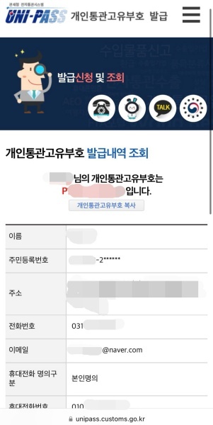 4. 본인인증이 완료되면 개인통관번호가 표시되고, 관세청 개인통관고유부호 발급시스템에서 재발급을 신청할 수 있습니다.