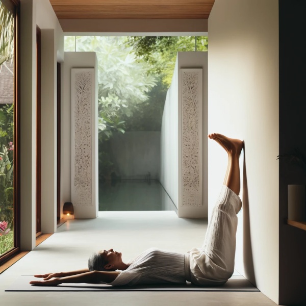 다리를 벽에 대고 누워서 하는 자세입니다,는 매우 효과적이고 접근하기 쉬운 요가 자세 중 하나입니다. 이 자세는 특히 혈액 순환 개선, 다리의 부기 및 피로 완화에 도움을 줄 뿐만 아니라 골반저 근육의 이완과 요실금 관리에도 유익합니다.
