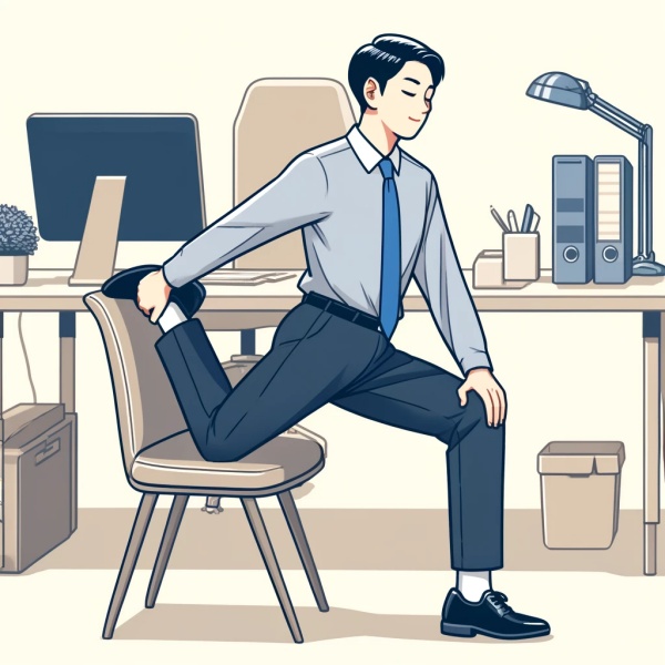 의자에 앉아 한쪽 다리를 다른 쪽 무릎 위에 올리고, 상체를 앞으로 숙여 허리와 고관절을 스트레칭합니다. 이 스트레칭은 허리와 엉덩이, 허벅지 근육의 긴장을 완화하고, 앉아 있는 동안 경직된 하체의 유연성을 개선합니다.