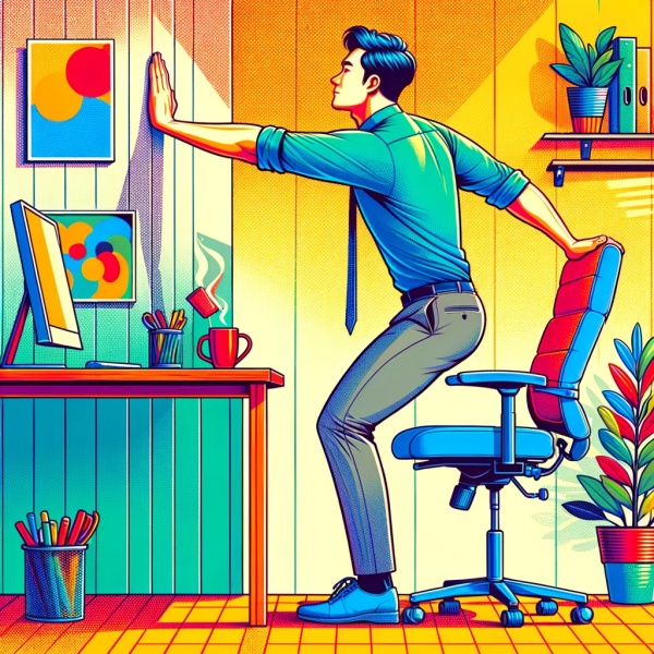 사무실 의자를 이용하여 팔을 어깨 높이로 들어 벽에 기대고 몸을 앞으로 밀어 팔과 등 근육을 늘립니다. 이 동작은 오랫동안 컴퓨터 작업으로 인해 긴장된 어깨와 등 근육을 효과적으로 이완시킵니다.