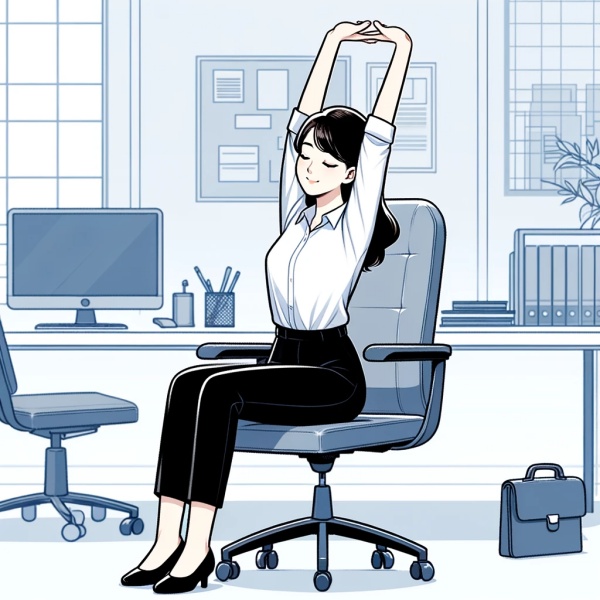 의자에 앉은 상태에서 어깨를 천천히 귀에 닿을 듯이 올렸다가 내립니다. 또한, 목을 좌우로 천천히 돌려 긴장된 목 근육을 풀어줍니다.